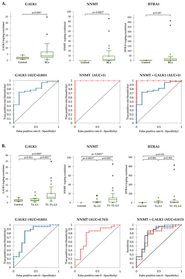 Diagnostic potential of GALK1, NNMT and HTRA1 for BCa diagnosis and prognosis. (A) Diagnostic accuracy for early detection of BCa. (B) Diagnostic accuracy for discrimination between non-invasive low-grade and invasive high-grade BCa. Normalized protein levels in urine of BCa patients and controls is represented in box plots while the diagnostic accuracy is depicted with receiver operating characteristic (ROC) curves as area under the curve (AUC). In the box plot graphs, median (−), 25th and 75th percentiles, minimum/maximum (•), outliers (∗) and mean (+) are presented. Statistically significant differences are marked (* p < 0.05).