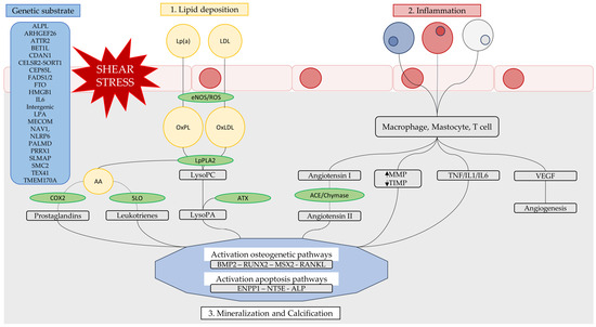 Initially, the pathological process was thought to be related to “wear and tear”. Today, it is thought to be a process more similar to atherosclerosis in subjects with a predisposing genetic substrate. The calcification process has a first phase of lipid deposition and inflammatory infiltration and a second phase of pro-calcific and pro-osteogenic factors activation [17] (Figure 2).