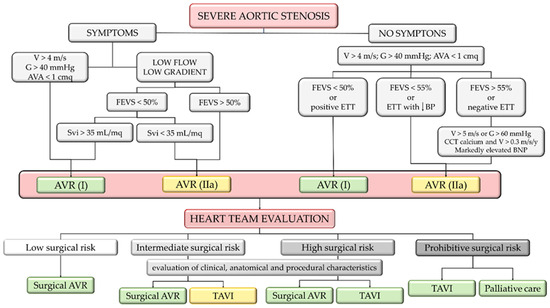 Flow chart for severe aortic stenosis treatment, according to VHD ESC guidelines 2021. In the figure, the green boxes indicate class I of recommendation, and the yellow boxes indicate class IIa of recommendation. The red box groups all conditions that need to be assessed by the heart team. V, aortic valve peak velocity; G, aortic valve mean gradient; AVA, aortic valve area; LVEF, left ventricular ejection fraction; Svi, systolic volume index; ETT, exercise tolerance test; BP, blood pressure; CCT, Cardiac Computed Tomography; BNP, brain natriuretic peptide; AVR, aortic valve implantation; TAVI, transcatheter aortic valve replacement.