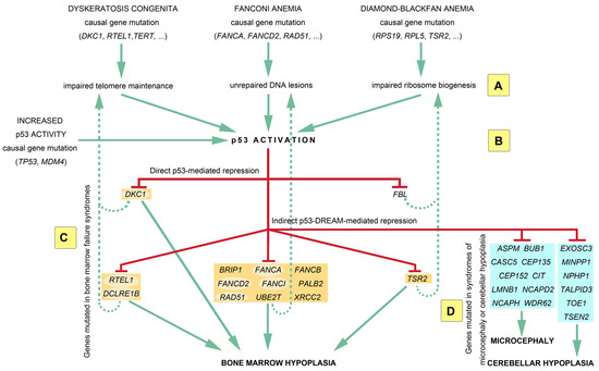 DREAM binding sites were notably identified for genes mutated in dyskeratosis congenita (RTEL1, DCLRE1B), Fanconi anemia (FANCA, FANCB, FANCD2, FANCI, BRIP1, PALB2, RAD51, UBE2T, XRCC2), and Diamond–Blackfan anemia (TSR2). These results suggest a model of molecular circuitry that may account for the partial clinical overlap between bone marrow failure syndromes of distinct molecular origins: independently of the initial causal mutation, the resulting molecular defect will lead to p53 activation, and this will lead to the repression of a set of genes implicated in telomere maintenance, DNA repair, and ribosome function (Figure 1). Due to positive feedback loops, the repression of these genes may lead to further p53 activation. Notably, some p53-repressed genes apparently have multiple functions, which may also contribute to overlapping clinical features. For example DKC1, DCLRE1B, and RTEL1 are crucial for telomere maintenance [96], but DKC1 was also implicated in ribosomal function [97], whereas DCLRE1B and RTEL1 were also implicated in DNA repair [98,99]. Likewise, FANCA, FANCD2, FANCI, and RAD51 are crucial for DNA repair [100], but FANCI may also impact ribosomal function [101], FANCD2 or RAD51 may play a role in telomere maintenance [30,102], and FANCA may act on both telomere maintenance and ribosomal function [103,104]. Importantly, p53 activation also leads to the DREAM-mediated repression of genes associated with syndromes of microcephaly (ASPM, BUB1, CASC5, CEP135, CEP152, CIT, LMNB1, NCAPD2, NCAPH, WDR62) or cerebellar hypoplasia (EXOSC3, MINPP1, NPHP1, TALPID3, TOE1, TSEN2), which might account for the brain-related phenotypes often observed in patients with DC [105], FA [100], and DBA [106] (Figure 1).