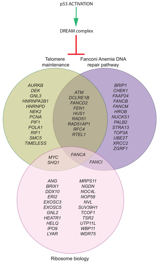 It should be noted that the molecular circuitry represented in Figure 1 includes only 28 of the 151 p53-DREAM targets identified and is, therefore, a simplified view. Figure 2 provides a more complete view of p53-DREAM target genes related to DC, FA, and DBA, but not necessarily mutated in either of these syndromes. In this Figure, sixty blood-related p53-DREAM targets are shown. They correspond to genes downregulated by p53, associated with GO terms relative to telomere maintenance, DNA interstrand crosslink repair or ribosome biology, and with promoter sequences bound by DREAM and containing an evolutionary conserved and appropriately mapped DREAM-binding site. Notably, GO term lists for murine genes were used in ref. [88], but we performed here a more comprehensive analysis by relying on GO term lists for both mice and humans and by integrating additional bibliographic data. Importantly, 13 out of the 60 genes are currently known to be implicated in two or three biological functions, which provides further evidence that these functions are intertwined (Figure 2). Furthermore, we should emphasize that with our current method, putative DREAM-binding sites were identified in the promoters of about half of the candidate p53-DREAM targets. Most notably, the FA-causal genes BRCA1 and BRCA2 appear as very good candidate p53-DREAM targets [26,88] for which DREAM-binding sites remain to be identified. In addition, some p53-DREAM target genes, the mutation of which may cause hematopoietic defects, were not included in Figure 2 because they are not associated with telomere, Fanconi, or ribosome-related GO terms. This is notably the case for NUF2 and MTHFD1 [107,108]. Thus, the impact of p53 on hematopoiesis includes additional genes that are not represented in Figure 2.