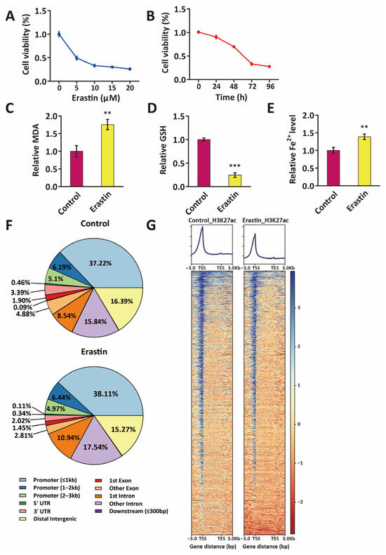 Distribution of active enhancers in ferroptotic glioblastoma cells. (A) Cell viability of U87MG treated with 0, 5, 10, 15, and 20 μM Erastin for 72 h, compared to control (blue line). Data represent means ± S.E.M. of three independent experiments. (B) Cell viability of U87MG that were treated with 10 μM Erastin for 0 h, 24 h, 48 h, 72 h, and 96 h, compared to control (red line). Data represent means ± S.E.M. of three independent experiments. (C–E) MDA assay, GSH assay, and ferrous iron assay indicate an increase of MDA (C), a decrease of GSH (D), and an accumulation of intracellular Fe2+ (E) in U87MG cells that were treated with 10 μM Erastin for 72 h. MDA, malondialdehyde; GSH, glutathione. Data represent means ± S.E.M. of three independent experiments. ** p < 0.01, *** p < 0.001, compared to control. (F) Pie chart showing the genome-wide distribution of active enhancer markers (H3K27ac) in U87MG and Erastin (10 μM, 72 h)-treated U87MG cells. (G) Heatmap showing H3K27ac ChIP-seq signal enrichment around TSS site in U87MG and Erastin-treated U87MG cells.