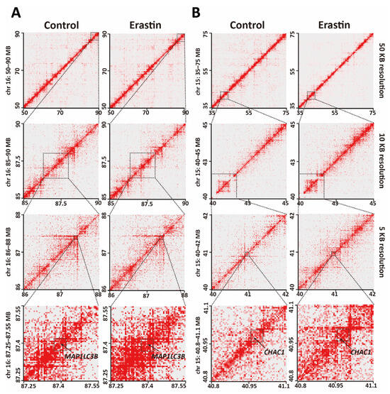 Changes in 3D chromatin structures in glioblastoma cell ferroptosis. (A,B) HiChIP heatmaps at a resolution of 50, 10, and 5 kb around MAP1LC3B (A) and CHAC1 (B) loci. Dotted squares indicate regions with increased chromatin interactions in Erastin (10 μM, 72 h)-treated U87MG glioblastoma cells compared to control.