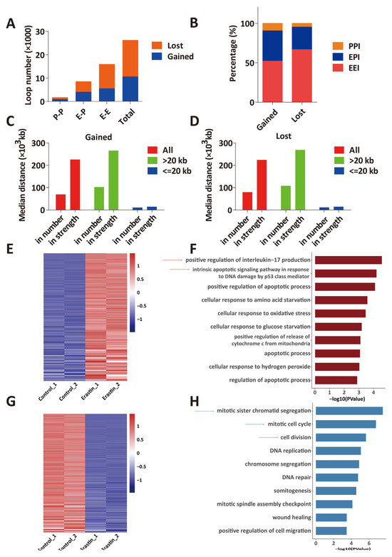 Changes in chromatin loops that were identified by HiChIP were categorized as gained (increased loop number and/or interaction strength) loops or lost (decreased loop number and/or interaction strength) loops in Erastin (10 μM, 72 h)-treated U87MG cells compared with control, and these loops include promoter–promoter (P–P), enhancer–promoter (E–P) and enhancer–enhancer (E–E). In total, 10664 gained loops were identified by HiChIP in ferroptotic glioblastoma cells, including 5563 E–E, 4108 E–P, and 993 P–P (Figure 5A,B). And 15595 lost loops were identified in ferroptotic glioblastoma cells, including 10404 E–E, 4461 E–P, and 730 P–P (Figure 5A,B). In addition, more long-range (>20 kb) chromatin interaction loops were gained or lost in ferroptotic glioblastoma cells (Figure 5C,D), suggesting a significant change of long-range enhancer connectome in ferroptosis.