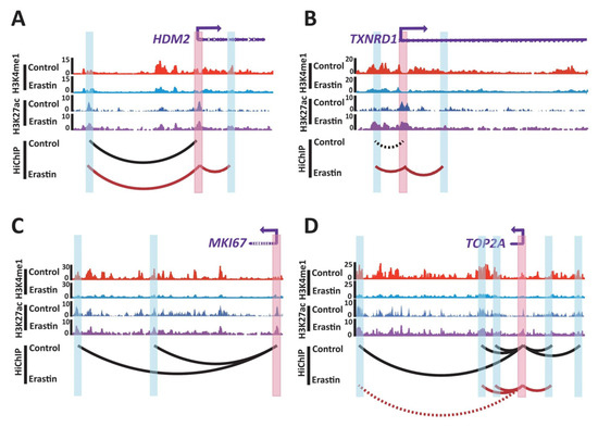 The genes that were significantly upregulated in Erastin (10 μM, 72 h)-treated U87MG cells and gained chromatin loops at their respective loci can be ranked by the padj value of the transcription fold change; among these, HDM2 and TXNRD1 emerged as the top two genes. Western blot was performed to validate the expression levels of HDM2 and TXNRD1 in control and U87MG glioblastoma cells that were treated with 10 μM Erastin for 72 h (Figure S2). HDM2 is a negative regulator of tumor suppressor p53 and binds to MDMX to facilitate ferroptosis in cells [30]. HiChIP data showed a new chromatin loop at HDM2 locus in Erastin (10 μM, 72 h)-treated U87MG cells, and RNA-seq data showed that HDM2 is significantly upregulated (log2FC = 2.44, padj = 2.91 × 10−239) in Erastin (10 μM, 72 h)-treated U87MG cells, suggesting function of the gained chromatin loop in regulation of HDM2 (Figure 5E and Figure 6A). TXNRD1 encodes thioredoxin reductase 1, which regulates cellular redox homeostasis [31]. TXNRD1 was reported to function in regulating the ferroptosis of liver cancer and chronic myeloid leukemia cells [32,33]. HiChIP data showed a chromatin loop that links a distal enhancer and promoter of TXNRD1 was strengthened in Erastin (10 μM, 72 h)-treated U87MG cells (Figure 6B), and a new chromatin loop that links an enhancer and promoter of TXNRD1 was identified in Erastin (10 μM, 72 h)-treated U87MG cells (Figure 6B). In addition, TXNRD1 was upregulated (log2FC = 2.04, padj = 1.26 × 10−216) compared to control (Figure 5E), which indicated that the gained chromatin loop is related to an increase of TXNRD1 expression. In addition, the genes that were significantly downregulated in Erastin (10 μM, 72 h)-treated U87MG cells and lost chromatin loops at their respective loci can be ranked by the padj value of the transcription fold change; among these, MKI67 and TOP2A emerged as the top two genes. MKI67 is a marker of cell proliferation that encodes the nuclear protein Ki67 [34]. HiChIP data showed that MKI67 locus lost two loops that link the MKI67 promoter and two distal enhancers in Erastin (10 μM, 72 h)-treated U87MG cells, and RNA-seq data showed that MKI67 is significantly downregulated (log2FC = −3.89, padj = 0) in Erastin (10 μM, 72 h)-treated U87MG cells (Figure 5G and Figure 6C). TOP2A encodes a nuclear enzyme that resolves entanglements and relieves the torsional stress of DNA double strands [35]. TOP2A is related to the cell cycle in embryonic stem cells [36]. A chromatin loop that links the TOP2A promoter and a distal enhancer was lost in Erastin (10 μM, 72 h)-treated U87MG cells, and another chromatin loop that links the distal enhancer and promoter of TOP2A was weakened (Figure 6D). TOP2A is also significantly downregulated (log2FC = −3.31, padj = 0) in Erastin-treated U87MG cells (Figure 5G). These data suggest the association of loss of chromatin loops and downregulation of MKI67 and TOP2A expressions.