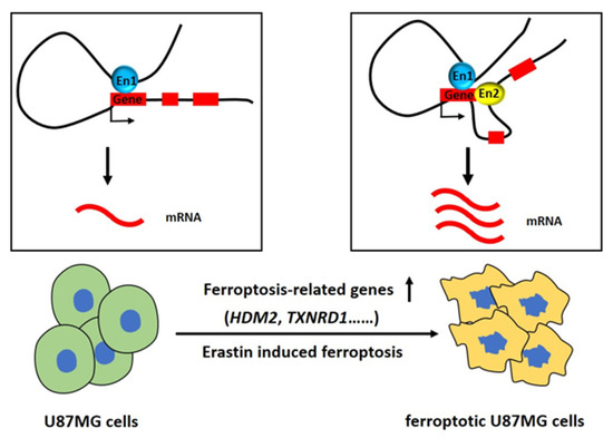 Schematics showed that some ferroptosis-related genes were upregulated and gained chromatin interaction loops between their respective loci and enhancers during Erastin-induced ferroptosis in glioblastoma. En: Enhancer. Blue and yellow rounds represent enhancers, red square represents ferroptosis-related gene, “↓” in the boxes represents transcription, “↑” below the boxes represents up-regulated expression.