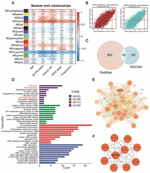 Identification of hub genes linked to neuroblastoma development using the Depmap and GEO datasets. (A) Heatmap of association of gene modules with clinical features. (B) Brown and turquoise module gene scatter plots. (C) Venn graph of overlaps in genes based on Depmap and WGCNA. (D) KEGG and GO analyses of 45 overlapped genes; these genes are most heavily enriched in the cell cycle, DNA replication and p53 signaling pathway. (E) PPI of 45 overlapped genes. (F) MCODE network clustering investigation of 45 overlapped genes.
