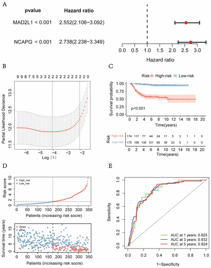 To further explore the hub genes involved in the progression of neuroblastoma, the GSE49710 dataset was partitioned into two datasets, namely the training dataset and the internal validation dataset, using a random split with a ratio of 7:3. We performed the LASSO-COX analysis (Tibshirani R. 1997) among these 10 genes to screen genes for risk signature construction in the training dataset, and two genes and corresponding regression coefficients were identified in the analysis (Figure 2A,B) [24]. Subsequently, the risk score was calculated as the sum of the product of each signature gene expression and its corresponding regression coefficient (The risk score = the NCAPG expression × 0.562 + the MAD2L1 expression × 0.416). For the training and internal validation dataset, high-risk and low-risk groups were identified using the median risk score as a cut-off value. Based on the Kaplan–Meier survival analyses conducted on the internal training and validation datasets, it was observed that the low-risk group exhibited a more favorable prognosis in patients diagnosed with neuroblastoma (Figure 2C and Figure S2A). Figure 2D and Figure S2B displayed neuroblastoma patients’ survival status and risk scores. The prognosis of neuroblastoma patients in internal training datasets and internal validation datasets could be accurately predicted by the risk score, according to the analysis of the ROC curve (Figure 2E and Figure S2C).