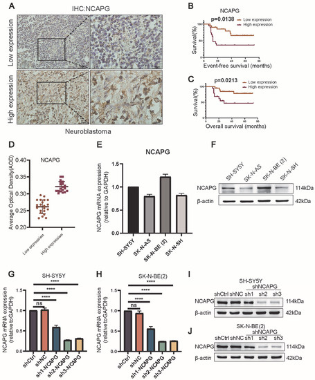 NCAPG expression in neuroblastoma tissues and cell lines. (A) Typical photograph of NCAPG protein staining intensity in neuroblastoma tissues. (B,C) Significant variations in EFS (p = 0.0138) and OS (p = 0.0213) between neuroblastoma patients with high and low NCAPG expression. (D) AOD of neuroblastoma tissues. (E,F) Levels of NCAPG mRNA relative to GAPDH and protein expression in SH-SY5Y, SK-N-AS, SK-N-BE (2), and SK-N-SH cells. (G,H) qRT-PCR to confirm NCAPG mRNA expression relative to GAPDH in lentivirus-transfected neuroblastoma cells. (I,J) Western blotting to detect the NCAPG protein expression in lentivirus-transfected neuroblastoma cells. Data are expressed as the mean ± SD for three independent experiments. ns: no significance, **** p < 0.0001.