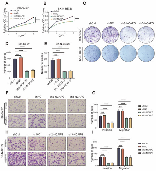 As a next step, we looked at NCAPG’s biological role in neuroblastoma cells. The results of the CCK-8 assays demonstrated a noteworthy reduction in cellular proliferation at 24, 48, and 72 h in SH-SY5Y and SK-N-BE (2) cells after the silencing of NCAPG, in contrast to cells that were transfected with shRNA control (Figure 5A,B). NCAPG downregulation inhibited the colony formation abilities of neuroblastoma cells in colony formation assays (Figure 5C–E). The function of NCAPG in migration and invasion was examined using transwell experiments in which SH-SY5Y and SK-N-BE (2) cells had reduced NCAPG expression levels. It was shown that SH-SY5Y and SK-N-BE (2) cells transfected with sh-NCAPG had a lower number of migrating cells than control cells. Moreover, neuroblastoma cells transfected with sh-NCAPG showed markedly reduced invasion ability (Figure 5F–I). The findings of these investigations provided evidence in favor of the conjecture that NCAPG functions as an oncogenic factor in human neuroblastoma cell lines, as its suppression impeded the cells’ ability to proliferate, migrate, and invade.