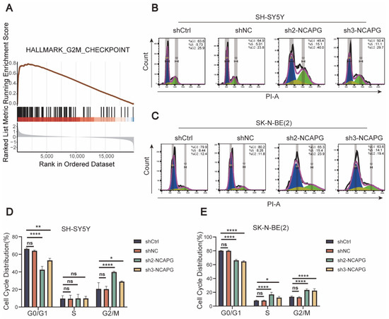 Effect of NCAPG depletion on the cell cycle of neuroblastoma cells. (A) GSEA analysis indicates a significant correlation between increased NCAPG expression and the G2M checkpoint. (B,C) NCAPG knockdown cells’ cell cycle development was recorded using flow cytometric analysis. (D,E) Cell cycle distribution in NCAPG knockdown cells. Data are expressed as the mean ± SD for three independent experiments. ns: no significance, * p < 0.05, ** p < 0.01, **** p < 0.0001.