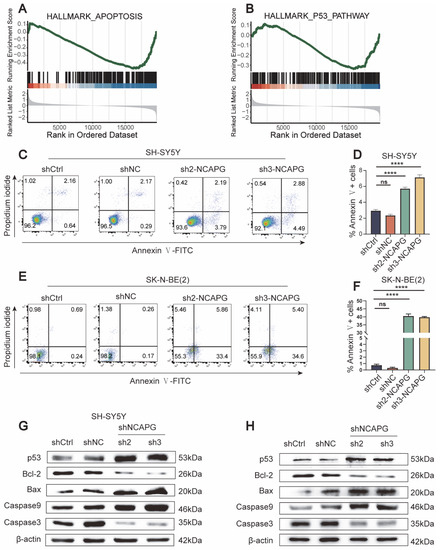 Effect of NCAPG depletion on the apoptosis of neuroblastoma cells. (A) GSEA analysis demonstrated that lower NCAPG expression is linked to apoptosis. (B) GSEA analysis demonstrated that decreased NCAPG expression is linked to the P53 pathway. (C–F) The percentage of NCAPG knockdown cells that underwent apoptosis was measured using an Annexin V/PI staining assay. (G,H) Western blotting was performed to quantify p53, Bcl-2, BAX, Caspase9, and Caspase3 protein levels after NCAPG was silenced in neuroblastoma cells. Data are expressed as the mean ± SD for three independent experiments. ns: no significance, **** p < 0.0001.