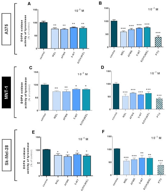 Firstly, we assessed the impact of subjected compounds on tyrosinase activity using amelanotic (A375, Sk-Mel-28) and highly pigmented (melanotic) (MNT-1) melanoma cells (Figure 1A–F). A significant decrease in TYR was noticed in all cellular models ranging from 18% to 26% for 10−6 M (Figure 1A,C,E) and from 26% to 49% for a higher dose (10−3 M) of melatonin and its metabolites (Figure 1B,D,F). Comparatively, treatment with 10−3 M N-phenylthiourea (PTU, positive control) triggered a drop in TYR activity on average of 61% versus control cells.