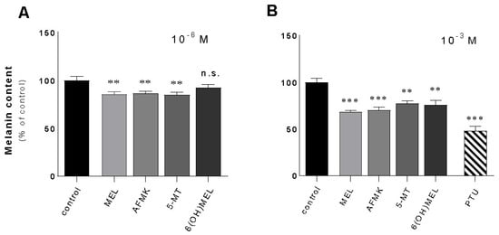 Melatonin and its metabolites reduced melanin content melanotic human MNT-1 melanoma cells. Cells were treated with MEL, AFMK, 5-MT and 6(OH)MEL for 72 h with 10−6 M (A) or 10−3 M (B) in comparison to melanogenic inhibitor, that is, 10−3 M PTU (positive control) and assessed as described in Materials and Methods. Data are presented as the mean + S.E.M. (n = 5) and values are normalized and expressed as percentage of the control value. Statistically significant differences are indicated as ** p < 0.01, *** p < 0.001, n.s.—not significant.