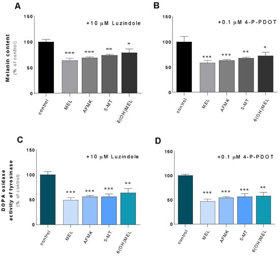 Cells were incubated for 72 h with MEL, AFMK, 5-MT, 6(OH)MEL followed by 2 h pre-incubation with luzindole or 4-P-PDOT as described above. To determine melanin content, cells were harvested, washed with 1×PBS, centrifuged at 1000× g for 10 min at 4 °C, and solubilized in 1N NaOH, and incubated for 2 h at 80 °C. Samples were centrifuged at 12,000× g for 10 min at room temperature (RT). The absorbances were measured at OD405 nm using a BioTek ELx808™ microplate reader, and results were presented as the percentage of the control sample.