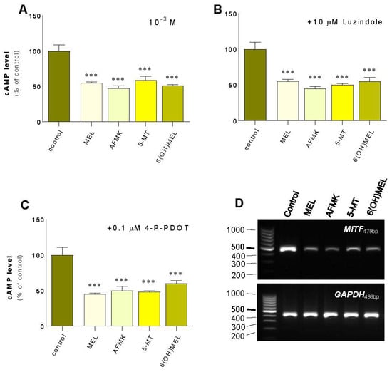 Evaluation of the effect of melatonin and its metabolites on cAMP level and MITF in comparison to the role of MT1/MT2 receptors. Human MNT-1 melanoma cells were treated for 72 h with 10−3 M MEL, AFMK, 5-MT or 6(OH)MEL and assessed for cAMP level (A). Comparatively, the role of MT1/MT2 receptors was assessed followed by 2 h pre-incubation with 10 μM luzindole (MT1/MT2) (B) or 0.1 μM 4-P-PDOT (MT2) (C) as described in Materials and Methods. Data are presented as the mean + S.E.M. (n = 5) and values are normalized and expressed as percentage of the control value. Statistically significant differences are indicated as *** p < 0.001. (D) PCR assessment of MITF expression in presence of MEL and its metabolites.