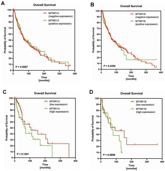 Kaplan–Meier survival curves and Gehan-Breslow-Wilcoxon test for overall survival of melanoma patients stratified by positive and negative MTNR1A mRNA expression (A), positive and negative MTNR1B mRNA expression (B), low and high MTNR1A mRNA expression (C), low and high MTNR1B mRNA expression (D) as described in Materials and Methods.