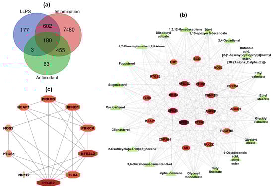 Network pharmacology analysis for antioxidant and anti-inflammatory mechanisms of LLPS. (a) Venn diagram of LLPS compounds, inflammation, and antioxidant targets. (b) Compound–target network. The green triangle nodes represent the active compounds of LLPS. The red-shade octagonal nodes represent the inflammation and antioxidant target genes of LLPS. (c) Protein–protein interaction (PPI) network of the top 10 core target genes evaluated by the MCC method. The color-shade nodes represent the degree of binding between proteins. A darker node represents a higher degree, and a lighter indicates a lower degree. LLPS: Lipophilic fraction from L. platyphylla seeds.