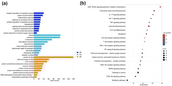 GO and KEGG pathway enrichment analyses. (a) The bar chart represents the top 10 enriched GO terms (p < 0.05) in the biological processes (BP), cellular components (CC), and molecular functions (MF) categories. (b) The bubble chart displays the top 20 enriched KEGG pathways.