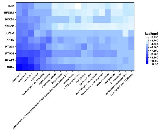 Alpha-selinene and 6,7-dimethyltetralin-1,5,8-trione also exhibited strong affinities with NOS2 (−7.3 and −7.7 kcal/mol, respectively), NR1I2 (−7.9 and −7.3 kcal/mol, respectively), PTGS2 (−8.0 and −7.8 kcal/mol, respectively), PTGS1 (−6.6 and −8.1 kcal/mol, respectively), and KEAP1 (−6.8 and −7.7 kcal/mol, respectively). Other compounds, including glyceryl monooleate, butyl linoleate, glycidyl oleate, 1,3,12-nonadecatriene, and 9-octadecenoic acid ethyl ester, exhibited binding energies below −7.0 kcal/mol with core target proteins. Although their biological properties have not been fully understood, some have been linked to exerting antioxidant and anti-inflammatory activities. For instance, selinene exhibits chemopreventive effects against preneoplastic lesions by increasing the activities of phase II detoxification enzymes []. Additionally, 9-octadecenoic acid ethyl ester inhibits the release of pro-inflammatory cytokines and mediators by downregulating the NF-κB and MAPK signaling pathways in LPS-treated RAW 264.7 macrophages [].