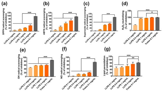Antioxidant activity of LLPS in cell-free systems. (a) DPPH, (b) ABTS+, (c) superoxide anion radical, (d) H2O2, (e) Hydroxyl radical, (f) NO radical scavenging activities, and (g) lipid peroxidation inhibition. Results are presented as the mean ± SD. Values of * p < 0.05, ** p < 0.01, and *** p < 0.001 are considered statistically significant differences. LLPS: Lipophilic fraction from L. platyphylla seeds.