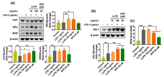 Antioxidant activity of LLPS in LPS-stimulated RAW 264.7 cells. The cells were pretreated with LLPS for 1 h prior to LPS (1 µg/mL) for an additional 6 h or 12 h. (a) Protein expressions of CAT, GPx, and SOD. (b) Protein expression of HO-1. (c) Intracellular ROS formation at 6 h. Results are presented as the mean ± SD. Values of * p < 0.05, ** p < 0.01, and *** p < 0.001 are considered statistically significant differences. LLPS: Lipophilic fraction from L. platyphylla seeds; SFN: Sulforaphane; LPS: Lipopolysaccharide.