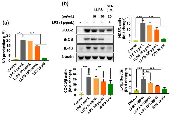 Anti-inflammatory activity of LLPS in LPS-stimulated RAW 264.7 cells. The cells were pretreated with LLPS for 1 h prior to LPS (1 µg/mL) for an additional 12 h. (a) NO production. (b) Protein expressions of COX-2, iNOS, and IL-1β. Results are presented as the mean ± SD. Values of * p < 0.05, ** p < 0.01, and *** p < 0.001 are considered statistically significant differences. LLPS: Lipophilic fraction from L. platyphylla seeds; SFN: Sulforaphane; LPS: Lipopolysaccharide.