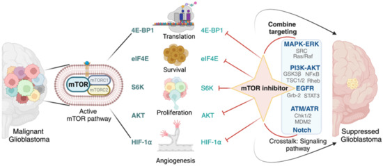 Identifying specific crosstalk interactions and understanding how they contribute to resistance is crucial for designing effective combination therapies. Rational combination strategies may target multiple pathways simultaneously, leading to synergistic effects and improved therapeutic responses. However, careful consideration of potential overlapping toxicities and individual patient characteristics is necessary to ensure the safety and tolerability of these combination treatments. Exploring the crosstalk between the mTOR pathway and other signaling pathways presents a promising avenue to combat resistance and enhance the efficacy of glioblastoma treatment (Figure 3).