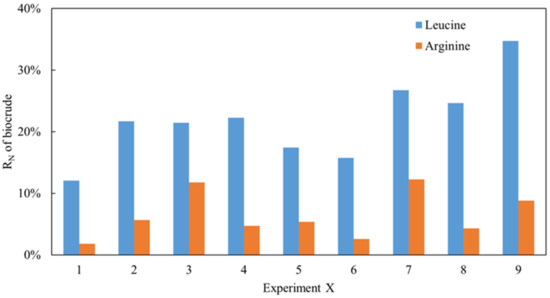 As reported in our previous works [8], the nitrogen recovery (RN) in biocrude obtained from Ch. was always higher than that of Sp., which may be a result of the protein being composed of several different types of amino acid. As analyzed, leucine is a common protein in Ch. while arginine is dominant in Sp. Two model compounds with both amino acids were employed in the project to simulate the thermal conversion process using the same methodology. As shown in Figure 1, under all conditions, the RN in the biocrude obtained from the arginine HTL was significantly lower than that of leucine despite arginine possessing a higher nitrogen content. Because of the low and similar levels of nitrogen content in solid residues detected, it can be inferred that the nitrogen in the raw material enters the aqueous phase typically when the N content is relatively low during the oil phase. This can also explain the distribution of nitrogen in the different phases of Ch. and Sp. with HTL and verify the aforementioned theories. Moreover, a range analysis of these orthogonal experiments of arginine and leucine was conducted as shown in Table 1 and Table 2, respectively. The K represents the sum of experimental data for a specific factor at a certain level. For example, K1, K2, and K3 in the first column represent the sum of the RN values at T = 240, 260, and 280 °C, respectively. k is the average value of K. R is the range value, which is found by subtracting the minimum value from the maximum value of k in the same column. In general, the greater the R value, the greater the impact the factor has on RN. As shown in Table 1, 6.91 was the maximum value amongst the three R values. This suggests that the RN of the biocrude from arginine was more sensitive to the solid loading rate. Similarly, the RN of the biocrude from leucine (Table 2) was more sensitive to the temperature. Interestingly, the residence time was not a key factor for both model compounds. Additionally, the optimal reaction conditions for arginine were T = 260 °C, RT = 60 min, and SLR = 10%, while those for leucine were T = 240 °C, RT = 30 min, and SLR = 10% based on the smallest K values for each parameter, which represents the lowest RN in the biocrude. A small solid loading rate could therefore be favorable for inducing less nitrogen into the oil phase during the HTL of amino acids.