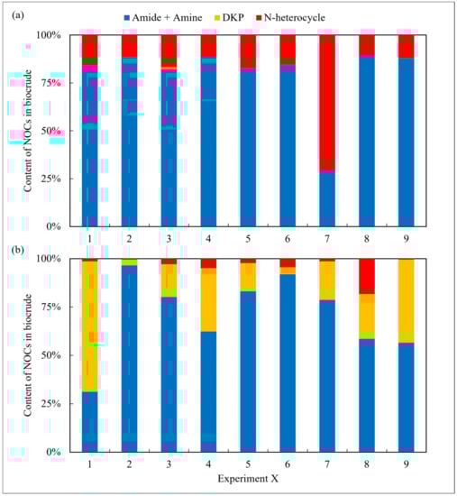 Not surprisingly, as shown in Figure 5c, Figure 7c andFigure 9c, the content of NHCs in the biocrude that converted from Sp. was evidently greater than that in the other two (Ch. and Na.). It is generally believed that NHCs are mainly formed via the Maillard reaction [15]. The results also demonstrated that reducing sugars obtained from the hydrolysis of carbohydrates in Sp. had a higher affinity for amines generated through decarboxylation from amino acids [29].