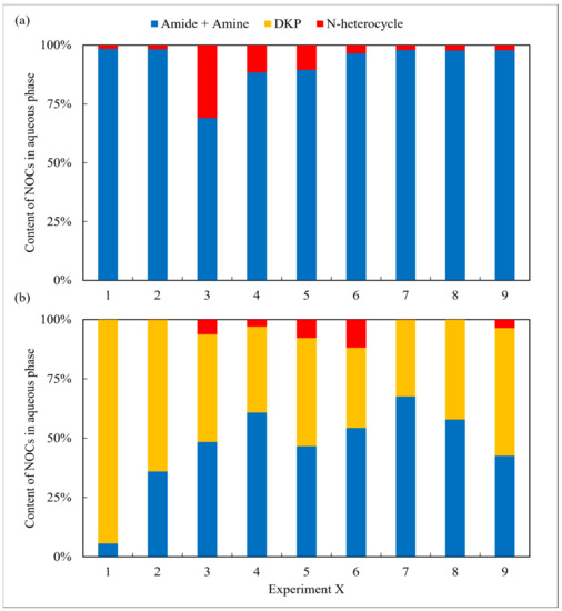 Furthermore, as shown in Figure 8, there were less visible changes in the content of NOCs. This may indicate that the previously mentioned transformation reactions among NOCs mainly occurred during the oil phase. It may also indicate that most of the NOCs that remained in the aqueous phase were relatively stable regardless of changes in residence time [27].