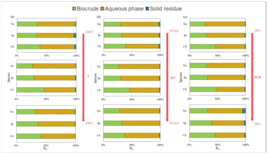 Nitrogen distribution of products from HTL of three microalgae under different conditions: (a) temperature (T); (b) residence time (RT); and (c) solid loading rate (SLR).