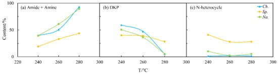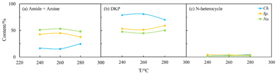 The N distribution of nitrogen in the biocrude from the three selected microalgae under different HTL conditions is summarized and displayed in Figure 4, while Figure 5 presents the effects of temperature. For Ch., 50 wt% of N was deposited in the biocrude at 260 °C (Figure 4a) when high amounts of amides and amines were detected (Figure 5a). As the temperature increased, the content of amides and amines gradually increased while DKPs (Figure 5b) decreased in the biocrude from Ch. and Na. This is consistent with findings in the literature [25], as many DKPs can be re-decomposed into free amino acids by changing the temperature, then decarboxylating to form amines, or deaminated into ammonia and finally, further acylating with fatty acids to form fatty amides. On the contrary, the existing forms of nitrogen for Sp. were less sensitive to the temperature either in the biocrude (Figure 5) or in the aqueous phase (Figure 6). This may be explained with the much more stable chemical structure of NOCs, which formed during Sp. HTL then decreased during the inter-conversions among different sorts of NOCs. As shown in Figure 6, although the contents of amides and amines and DKPs in the aqueous phase from Ch. were different from those of the other two microalgae at low temperatures, the content of NOCs from three microalgae gradually became more similar when the temperature was increased to 280 °C. This indicated that more complicated reactions took place at higher temperatures, producing more N-related intermediates generated at low temperatures to further transform and finally stabilize in the aqueous phase through a series of reactions.