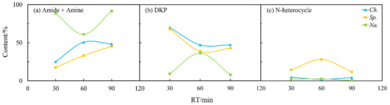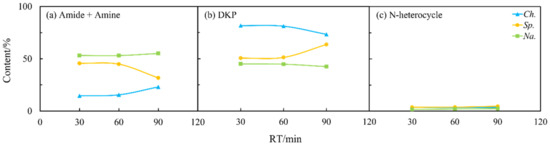 As shown in Figure 4b, the longer residence time could allow more nitrogen to be transferred into the aqueous phase and thus improve the quality of the biocrude as previously reported [26]. Figure 7 and Figure 8 illustrate that the contents of amides and amines, DKPs, and NHCs for Sp. in both the oil and aqueous phases varied drastically with residence time. The DKPs in the biocrude were eliminated while amides and amines and NHCs were increased from 30 to 60 min and kept stable. With the residence time extended to 90 min, the NHCs decreased significantly while amides and amines kept increasing. This suggests that some DKPs decomposed into amino acids, which participated in other reactions to form NHCs and amides at a short residence time. With the time extended, the chemical structure of DKPs became stabilized in both phases, where only some NHCs further reacted and transformed into amides and amines. For Ch. and Na., the effects of the residence time on the formation of NHCs were less apparent compared to its effect on amides and amines and DKP. Amides and amines from Na. evidently decreased, initially from 30 to 60 min and then back to the initial content, which were directly opposite to those from Ch. It is worth noting that the increasing or decreasing of DKPs in the biocrude with residence time was always accompanied with the elimination or booming of amides and amines. This provides further evidence for the aforementioned inter-transformation between amides and DKPs.