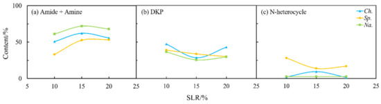 Effect of solid loading rate (SLR) on the content of different NOCs: (a) Amide + Amine; (b) DKP; and (c) N-heterocycle in the aqueous phase from HTL of three microalgae.