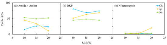 As shown in Figure 4 and Figure 9, the solid loading rate had some effects on the nitrogen distribution in the biocrudes and solid residues, especially for Na. and Sp. The content of amides and amines in the biocrude from three microalgae first increased and then more or less changed with the solid loading rate (Figure 9a) when DKPs were decreased (Figure 9b), which is consistent with the aforementioned theory on the transformation occurring between amides and amines and DKPs. Moreover, the solid loading rate had a significant effect on NOCs in both phases for Sp. (Figure 9 and Figure 10). The content of amides and amines gradually decreased with the solid loading rate while DKPs and NHCs kept increasing in the aqueous phase. The corresponding changes in the biocrude are directly opposite in particular for amides and amines and DKPs. These results demonstrated that the solid loading rate could not only change the distribution of nitrogen during HTL but also influence existing forms of nitrogen especially for Sp. [28]. However, the contents of NOCs in the biocrude and aqueous phase from Na. both changed very little. It can be inferred that Na. was not sensitive to the variations in the solid loading rate.