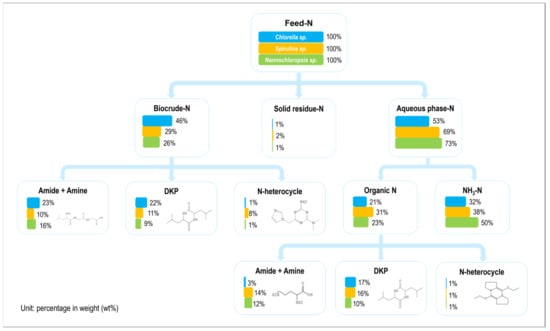 Figure 11 illustrates the mass flow and existing forms of nitrogen during the HTL of three microalgae under the same reaction conditions. In general, the nitrogen in the microalgae prefers to end in the aqueous phase and primarily exists in the form of ammonia nitrogen [30,31]. Whether it was in the aqueous phase or biocrude, most of the organic nitrogen existed in the form of amides, amines, or DKPs, while a small amount existed in the form of NHCs like pyridine [32,33,34]. However, the proportion of NHCs in the biocrude from Sp. was evidently higher than that in the two other microalgae. Furthermore, the proportion of amides and amines was a bit lower, and the proportion of DKPs was close to the amides and amines whether it was in the aqueous phase or biocrude. It can be inferred that the intermolecular cyclization and the acylation reaction for amino acids are almost equally important during Sp. HTL [35]. The Maillard reaction also played a crucial role in the composition of the oil phase [36] as opposed to the results found for the other two microalgae. This further demonstrated that the similarity in the chemical compositions of microalgae cannot determine the nitrogen pathway during HTL [37,38]. Moreover, Figure 11 illustrates that nitrogen in the aqueous phase existed abundantly in the form of ammonium (approx. 70 wt%) for Na. The proportion of DKPs was relatively small whether it was in the biocrude or aqueous phase. This is because the content of DKPs, which was formed with the intermolecular cyclization of amino acids, was reduced during the initial stage of the reaction. It was replaced with the deamination of amino acids to form ammonia, which dissolved during the aqueous phase as ammonium nitrogen [39,40]. In contrast, the proportion of amides and amines in the aqueous phase was low in the case of Ch. Its nitrogen preferred to enter into the oil phase and exist in the NOCs except for NHCs.