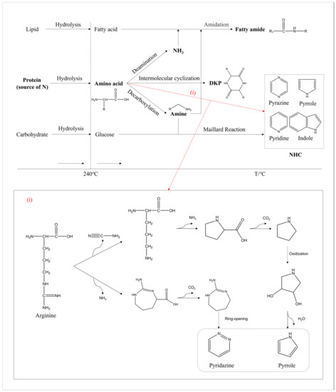 As shown in Figure 12, a pathway map of nitrogen during HTL was further improved based on our previous study [8]. The hydrolysis of macromolecules occurred at a relatively low temperature. Lipids decomposed into glycerol and fatty acids, while proteins decomposed into amino acids and carbohydrates decomposed into monosaccharides such as glucose [41]. Upon increasing the temperature, some amino acids formed into ammonia through deamination, some into DKPs via the intermolecular formation of cyclization, and some into amines through decarboxylation [42,43]. Afterwards, the amidation reaction occurred when ammonia or amines reacted with fatty acids to form amides. Additionally, the Maillard reaction between amine and glucose produced NHCs such as pyridines and indoles.