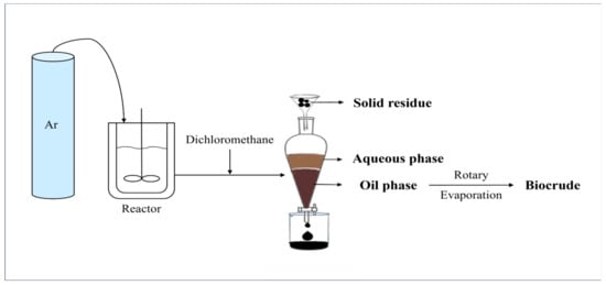 The experimental procedure is shown in Figure 13. A 500 mL reactor was employed in this project. According to the calculations, the reactor was filled with a specific amount of microalgae powder and deionized water. Next, air in the reactor was purged using argon. To ensure that the reactor was well-sealed, a leak test was conducted after each injection of argon. The reactor was first heated using a furnace at a heating rate of 3 °C/min to a preset temperature. This was regarded as the starting point of the test, with the temperature remaining constant for the remainder of the preset residence time. The reaction was then stopped after shutting down the heater, and ice water was used to cool down the system quickly. Afterwards, the gas sample was collected using a sampling bag and then the remaining gas was completely discharged via the gas processing tube in the fume hood. After the reactor was opened, dichloromethane was added into the vessel twice to dissolve and wash out all products. After vacuum filtration, the filter residue, which was considered as the/used as the solid residue, was dried in a vacuum oven for 12 h. In order to separate the aqueous phase and oil phase, the filtrate was poured into a separatory funnel and allowed to sit for at least 30 min. In the separatory funnel, the aqueous phase was at the top and the organic phase was at the bottom. Finally, rotary evaporation at decompression conditions was employed to separate the biocrude from dichloromethane.