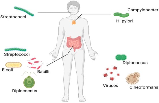 Human microbiomes in different parts of the body. These bacteria can affect cancer progression and the outcome of other diseases. Created with BioRender.com (accessed on 21 September 2023).