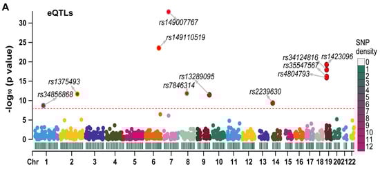 We generated Manhattan plots for the independent eQTLs (Figure 3A) and pQTLs (Figure 3B) using the “CMplot” R package [10]. The p values for three pQTLs (rs3745368, rs117029024, and rs149110519) were extremely low (6.75 × 10−192, 1.21 × 10−122, and 4.34 × 10−68, respectively), and we compressed these values to 1 e−50 for better display of other pQTLs in the Manhattan plot. The Z scores of eQTLs (Figure S2A) and pQTLs (Figure S2B) were also presented. All statistical values related to RETN eQTLs and pQTLs are listed in Table S1.
