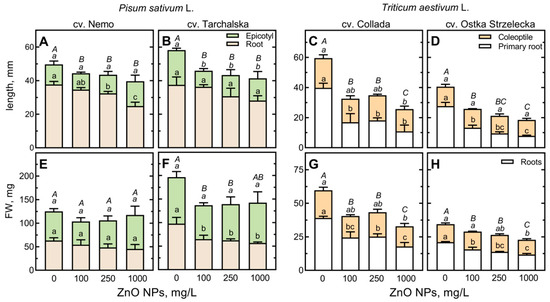 The effects of ZnO NPs (at concentrations of 0, 100, 250, and 1000 mg/L) on the length and fresh weight (FW) of roots and shoots (epicotyl of pea and coleoptile of wheat) of 4-day-old seedlings of pea (Pisum sativum L.) cv. Nemo (A,E) and cv. Tarchalska (B,F) and 3-day-old seedlings of wheat (Triticum aestivum L.) cv. Collada (C,G) and cv. Ostka Strzelecka (D,H). Values are means of 3 replicates + SD. The same lowercase letters (for shoots and roots, separately) and uppercase letters (for total seedlings length) above the bars indicate no significant (p < 0.05) differences according to the ANOVA test and post hoc Tukey’s corrections.
