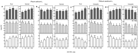The concentration of total soluble carbohydrates (TSCs), total amino acids (TAAs), and total organic acids (TOAs) in the roots and epicotyls of 4-day-old seedlings of pea (Pisum sativum L.) cv. Nemo (A) and cv. Tarchalska (B) and roots and coleoptiles of 3-day-old seedlings of wheat (Triticum aestivum L.) cv. Collada (C) and cv. Ostka Strzelecka (D). Values (in mg/g DW) are means of 3 replicates + SD. The same letters above the bars indicate no significant (p < 0.05) differences according to the ANOVA test and post hoc Tukey’s corrections.