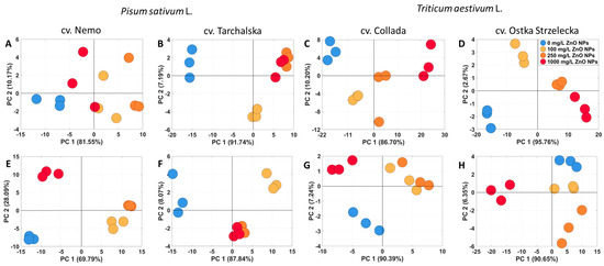 PCA of metabolic profiles of roots (A,B) and epicotyls (E,F) of 4-day-old seedlings of pea (Pisum sativum L.) and roots (C,D) and coleoptile (G,H) of 3-day-old seedlings of wheat (Triticum aestivum L.) developed in suspension of ZnO NPs at 0, 100, 250, and 1000 mg/L.