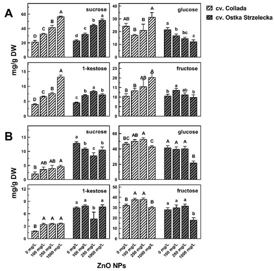 The effect of ZnO NPs on the concentration of sucrose in coleoptiles was different, causing a 2-fold increase in cv. Collada, while a decrease in cv. Ostka Strzelecka (Figure 5B). Besides sucrose, root tissues (both cultivars) under ZnO NPs treatment accumulated 1-kestose. The concentration of this fructan was also duplicated in coleoptiles of cv. Collada (Figure 5). However, the correlations between changes in the concentrations of sucrose plus 1-kestose and monosaccharides (fructose plus glucose) in roots were opposite, i.e., positive in cv. Collada and negative in cv. Ostka Strzelecka (r = 0.72 and r = −0.90, respectively, Table S12). No correlations were found in coleoptiles (Table S12).