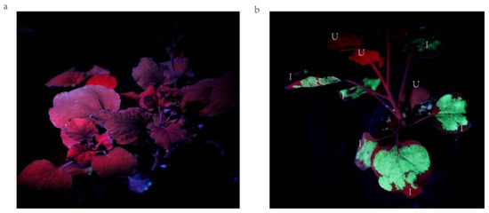 Visualization of GFP expression in N. benthamiana plants under UV light. (a). Normal tobacco plants under UV light; (b). GFP protein expression on tobacco leaves 3 days after injection under UV light. I, inoculated leaves; U, uninoculated leaves.