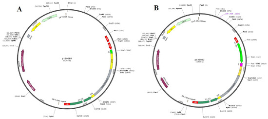 To effectively manipulate gene expression in peppers, we constructed geminivirus-based expression vectors (p1300BR, p1300BK, and p1300BZ) using the ClonExpress MultiS One Step Cloning Kit strategy (Vazyme, Nanjing, China). These vectors were strategically designed to deliver the CrtW and CrtZ genes and were derived from the Cotton leaf curl Burewala virus. The p1300BGFP was a modified insertion portion of the putative BeYDV genes V1, V2, C1, C1:C2 (Genebank:NC 003493.2) into pCAMBIA1300. The amplified product was restricted with pstI/SacI and cloned into the pstI and SacI sites of p1300BGFP, resulting in p1300BR, and p1300BZ. All of the recombinant vector constructs have been confirmed by restriction digest, polymerase chain reaction, and the associated sequence analysis.