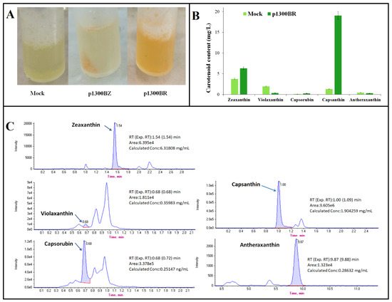 The pepper powder was subjected to treatment with cell lysate and subsequently centrifuged. It was observed that both p1300BR and p1300BZ appeared darker than the control, Mock, with p1300BR displaying the most pronounced red coloration (Figure 4A). Zeaxanthin, violaxanthin, capsorubin, capsanthin and antheraxanthin were analyzed by HPLC-MS/MS. Peak absorbance was determined at 450 nm (Figure 4B). The results indicated that capsanthin production was the highest among the products, except for zeaxanthin, that exhibited a substantial increase, reaching approximately 19-fold higher levels in p1300BR when compared to the Mock sample (Figure 4C).