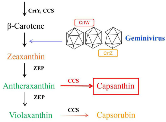 Synthesis pattern of capsanthin under a geminivirus expression system. CrtW—β-carotenoid ketolase; CrtY—lycopene β-cyclase; CrtZ—β-carotenoid hydroxylase; CCS—capsanthin/capsorubin synthase; ZEP—zeaxanthin epoxidase.