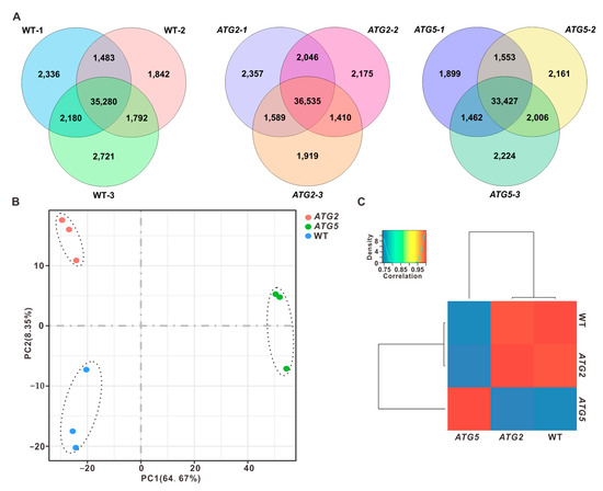 Global transcriptome analysis of WT, ATG2-silenced, and ATG5-silenced pollen (A). Overlap analysis of detected genes in three independent biological replicates. (B). Principal component analysis of the transcriptomes of WT, ATG2-silenced, and ATG5-silenced pollen. (C). Clustering analysis the transcriptome of WT, ATG2-silenced, and ATG5-silenced pollen according to the Pearson’s correlation efficient.